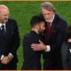 NEWCASTLE UPON TYNE, ENGLAND – MAY 25: Newcastle players Alexander Isak and Bruno Guimaraes shake hands during the Premier League match between Newcastle United FC and Everton FC at St James’ Park on May 25, 2025 in Newcastle upon Tyne, England. (Photo by Stu Forster/Getty Images)