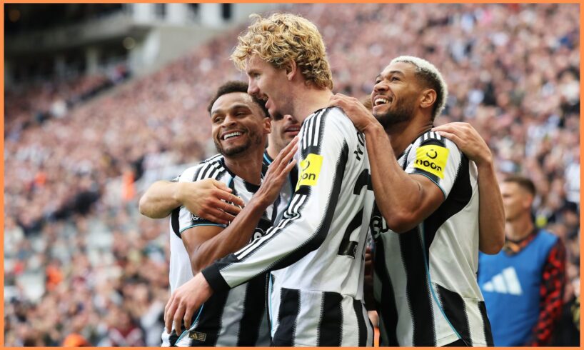 Nick Woltemade celebrates with his Newcastle teammates (Photo by Matt McNulty/Getty Images)